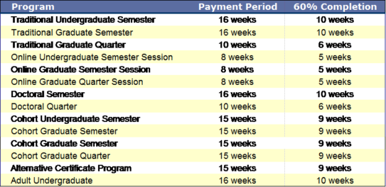 The chart below represents the approximate number of weeks for each program type students need to complete to retain all aid that was disbursed for the payment period (minimum of 60% of the payment period).